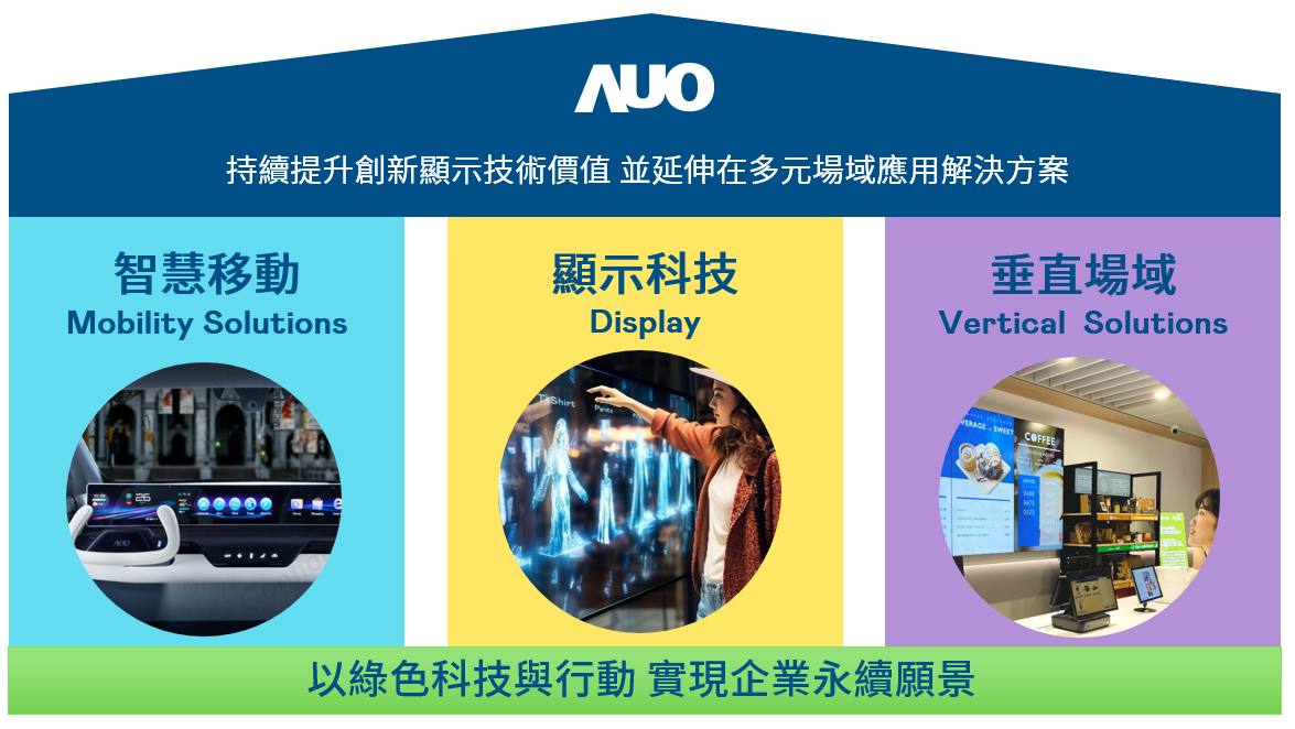 我們持續推動「雙軸轉型」,在精進顯示技術附加價值(Go Premium),與深化垂直市場應用(Go Vertical)的策略下,對應爱游戏网页版官方入口的優勢競爭力與趨勢,我們奠定顯示技術、智慧移動、垂直場域三大永續營運支柱,在顯示技術領域的根基之上,延伸布局多元場域應用解決方案。將先進顯示科技助力智慧移動及垂直場域發展,並以綠色科技與行動為實踐,在轉型之路上貫徹永續經營之願景。